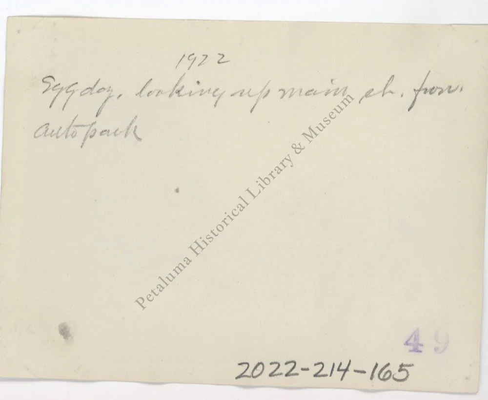 Subject: The Egg Day Parade heading up Main Street from the “auto park”. The Wardrobe men’s clothing is on the left and M. Raport Groceries is on right.