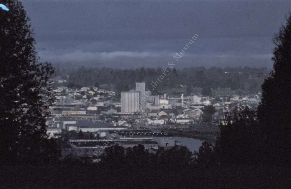 Description: A panoramic picture of the commercial area of Petaluma and the surrounding houses and wood areas.